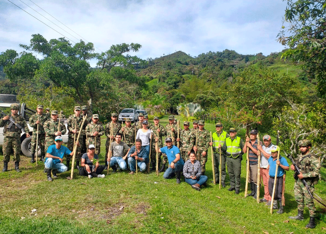 Au cours d'une activité qui a commencé très tôt, le Héros du Bicentenaire du Bataillon d'Infanterie No.38 'Miguel Antonio Caro', a travaillé sur le protocole préparation du terrain avec le compost, la consistance et le drainage de la terre, creusant par la suite, des trous pour la plantation de plus de 8.000 arbres propres de la région, des plantes protectrice des ravins El Palmar de Vergara et la Berberia, quie sont les sources d'eau qui alimentent l'aqueduc de Tobia, dans la municipalité de Nimaima.