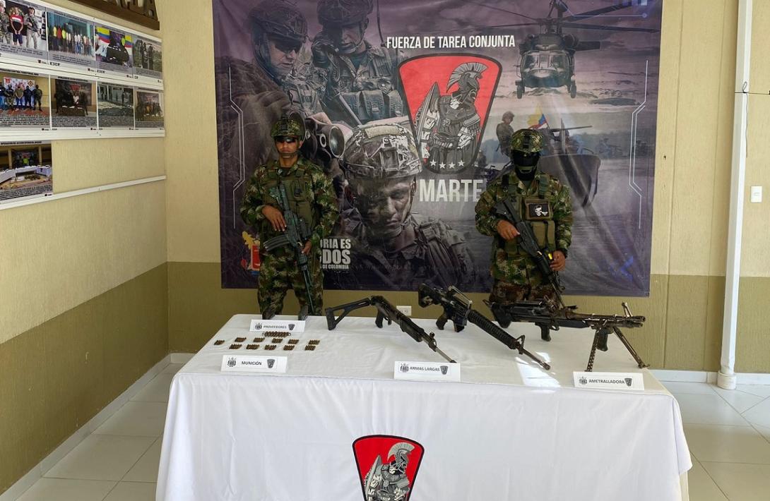 A machinegun, two long rifles and military accessories material for the exclusive use of the Military Forces were found by troops at the scene.