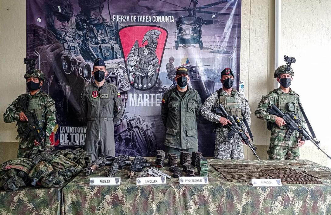 Firearms, magazines, ammunition units, communications equipment and clothing for the exclusive use of the Military Forces were found by troops at the scene.