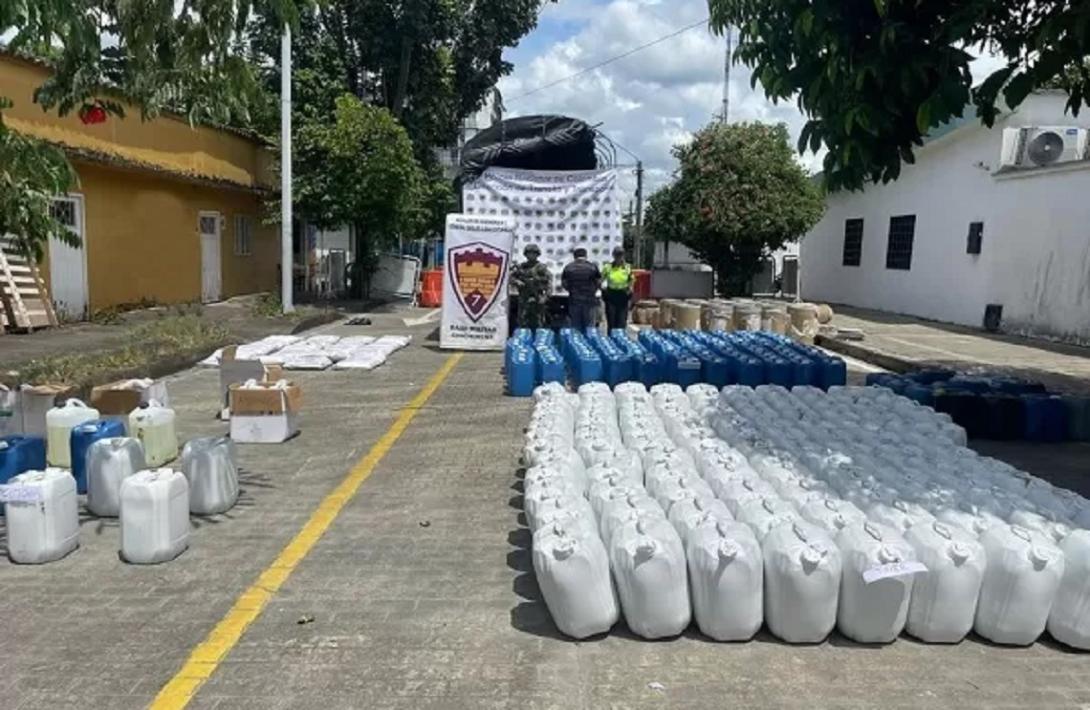 En el vehículo tipo camión se hallaron elementos avaluados en más de 80 millones de pesos, entre los que se encontraban 550 galones de disolvente, 565 galones de thinner, 100 galones de ácido sulfúrico, 45 galones de acetona, 50 galones de amoniaco, 500 kilogramos de soda cáustica y 960 kilos de metabisulfito de sodio.