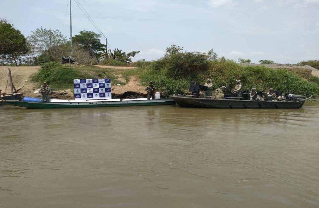 La première confiscation a été possible à un point de contrôle de rivière sur la Rivière Cauca, près de la municipalité de Guaranda (département de Sucre), où les troupes du Bataillon d'Infanterie No. 17, lors de l'inspection de deux bateaux rudimentaires, ont trouvé 720 gallons De gazole, répartis dans 12 barils en plastique de 60 gallons chacun.